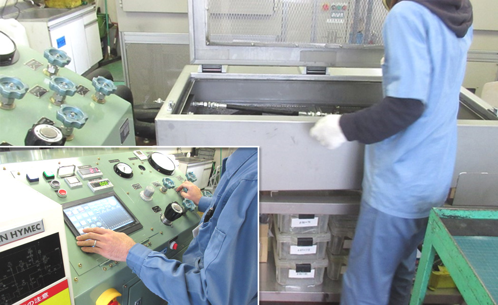 実車ホース組付け環境を忠実に再現した試験機にて製品の限界を見極めます。